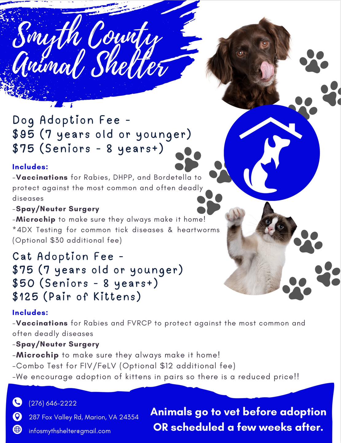 Announcing new adoption services and fees at the Smyth County Animal Shelter. Vet services are being scheduled and/or provided prior to your new pet going home including spay/neuter, vaccines, and microchip. Getting these services after adoption would typically cost new pet owners 2 or 3 times MORE. If you are interested in adopting please fill in the Adoption Application Form (opens a new page). It is short, sweet, and helpful when processing adoptions. Please call in advance for an appointment to meet the pets on 276-646-2222 option 1. We look forward to continue serving the pets and their people of Smyth County.